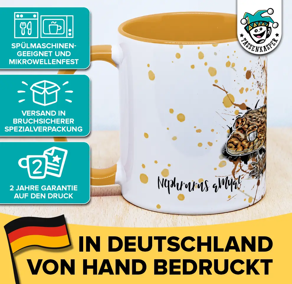 Diese Tasse ist ein Muss für alle, die Reptilien lieben! Sie besticht durch ihren goldgelben Henkel und die Innenseite sowie das beeindruckende Gecko-Motiv des Nephrurus amyae (Rauer Knopfschwanzgecko) auf der Außenseite.