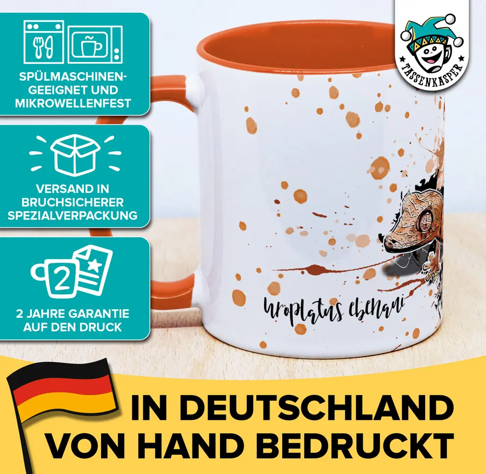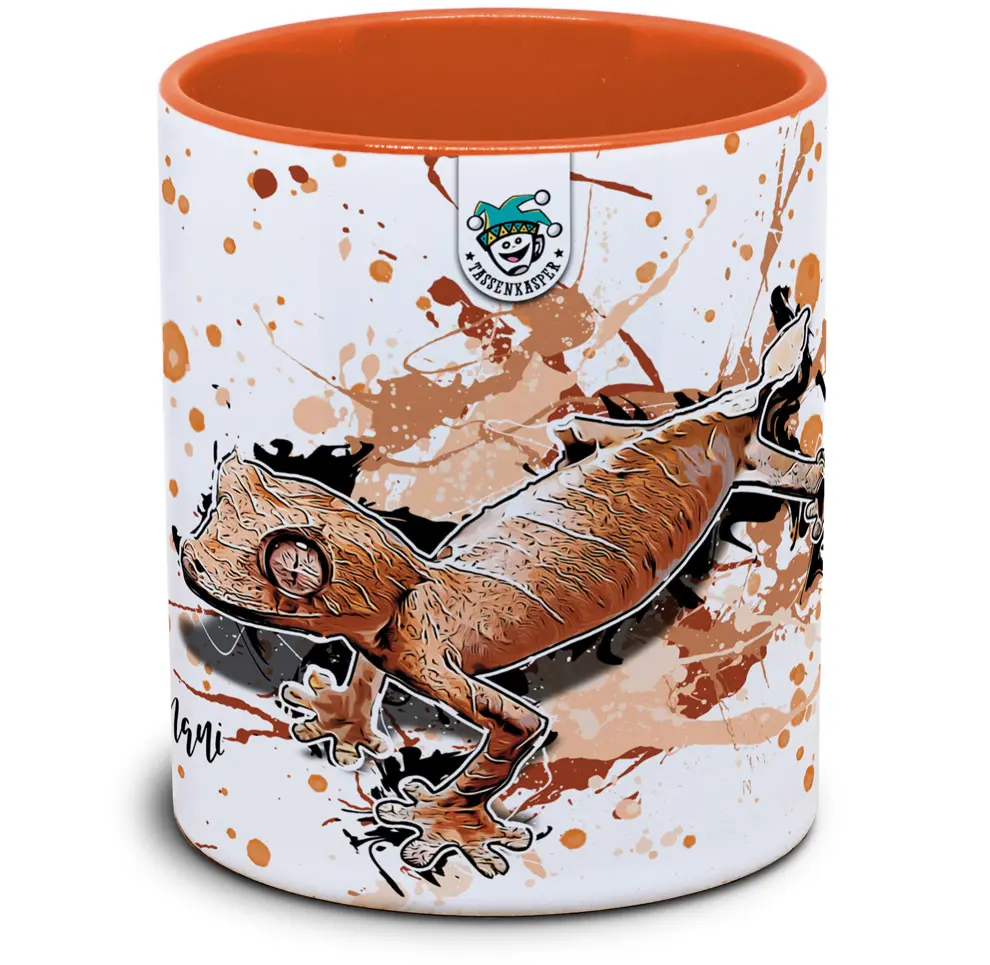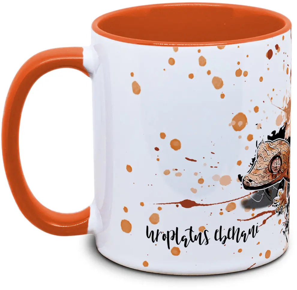 Diese Tasse ist ein Muss für alle, die Reptilien lieben! Sie besticht durch ihren orangenen Henkel und die Innenseite sowie das beeindruckende Gecko-Motiv des Uroplatus ebenaui (Pfeilschwanzgecko) auf der Außenseite.