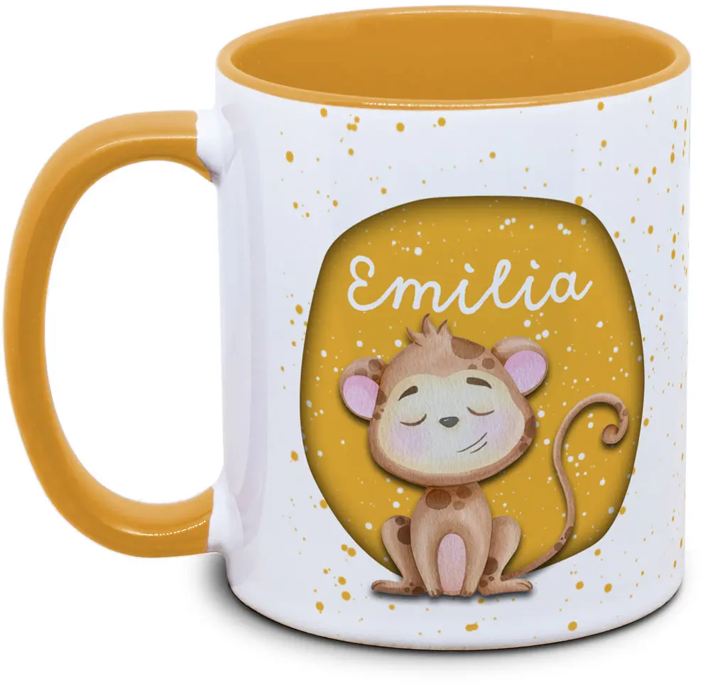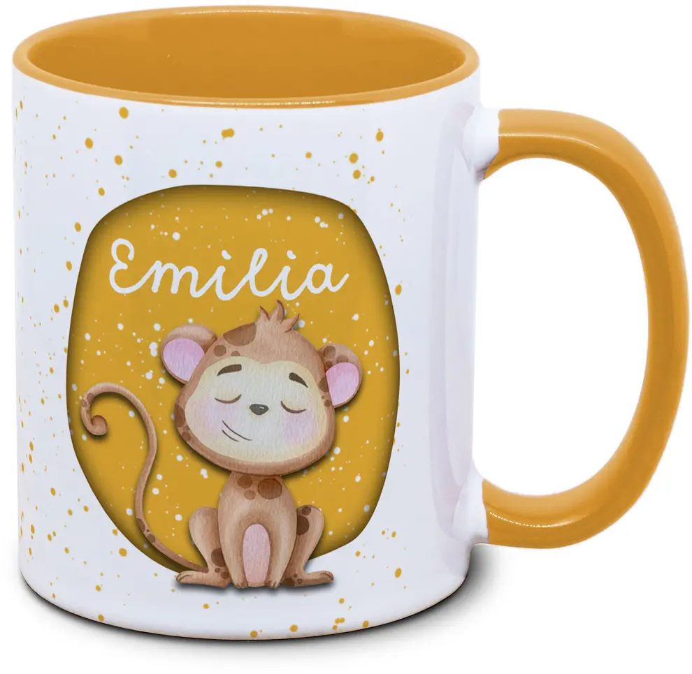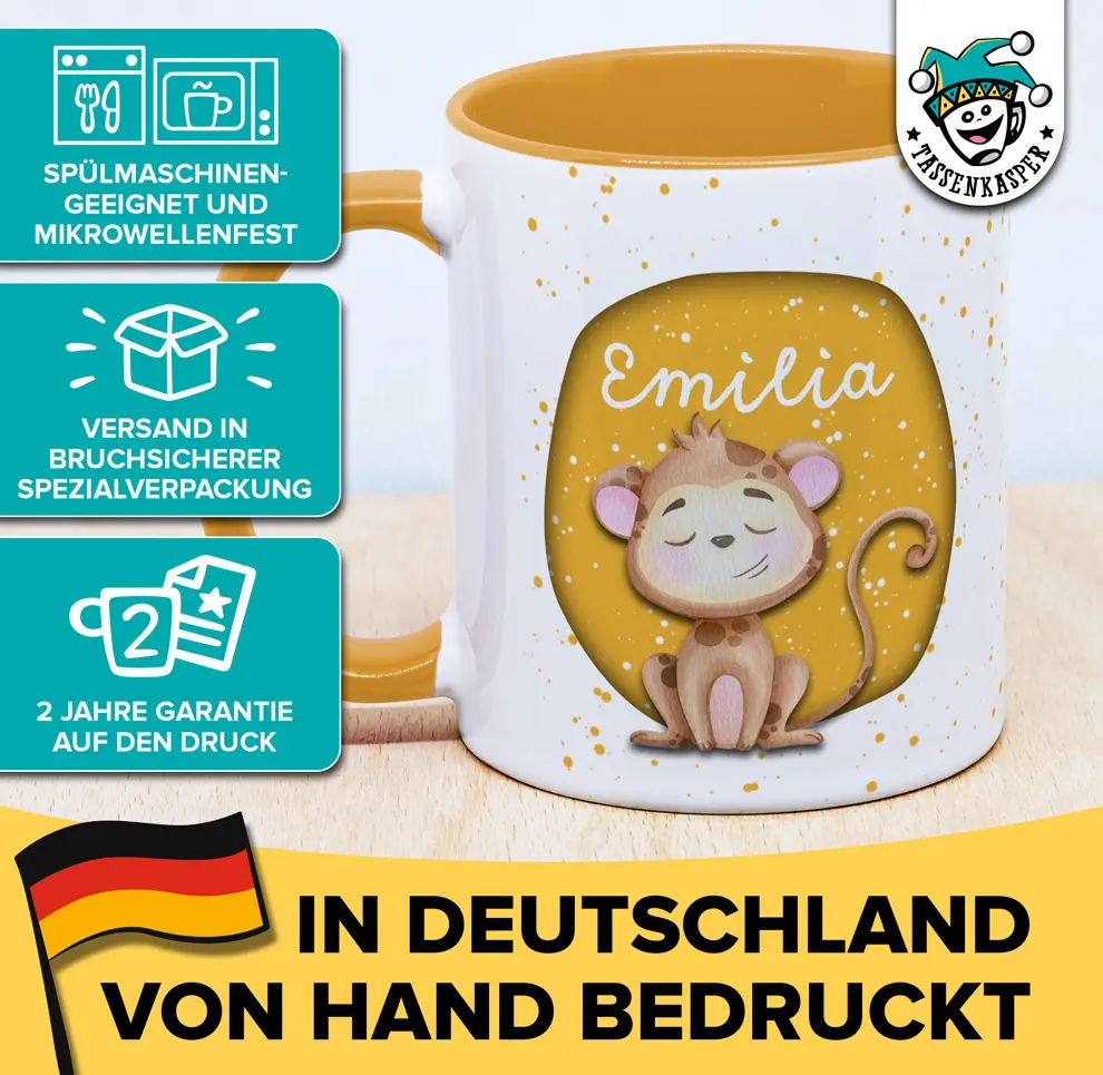 - Affiges Design: Die Tasse wird mit einem niedlichen Affenmotiv und dem Namen deines Kindes bedruckt.