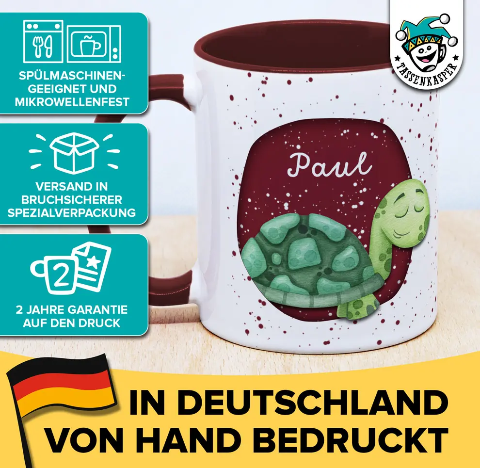 😆 Personalisierte Tasse für Menschen, die man irgendwie schon ziemlich mag!Diese hochwertige Keramiktasse ist das perfekte Geschenk für Menschen, die man irgendwie schon so ein wenig total gern hat – oder zumindest nicht als Erstes loswerden will. Mit dem frechen Spruch "Du bist lustig! Dich töte ich zuletzt." und einem individuellen Namensdruck wird sie zum einzigartigen Hingucker für alle, die schwarzen Humor lieben. 😜☕🎁 Perfekte Geschenkidee für Freunde mit Sinn für Humor:Ob für die beste Freundin, den coolsten Kollegen oder den Partner mit schwarzem Humor – diese individuell gestaltete Tasse bringt garantiert ein Schmunzeln ins Gesicht!🔥 Deine individuelle Tasse:🎨 Edles Design: Henkel & Innenseite in Bordeauxrot – stilvoll & auffällig.📌 Personalisierung: Wunschname wird individuell aufgedruckt.🌟 Hochwertiger Qualitätsdruck für langanhaltende Freude.📋 Produktdetails:💧 Spülmaschinengeeignet nach BS EN 12875-4 – langlebiger Druck auch nach vielen Spülgängen.🌡️ Mikrowellenbeständig nach BS EN 15284:2007 – alltagstauglich & praktisch.☕ Fassungsvermögen: ca. 330 ml – ideal für Kaffee, Tee oder andere Lieblingsgetränke.🌟 Hervorragende Haltbarkeit des Druckbildes für langfristige Farbbrillanz.🎉 Unser Versprechen: Freude zu bereiten steht bei Tassenkasper an erster Stelle! Deshalb geben wir 2 Jahre Garantie auf den Druck. Wir verwenden ausschließlich hochwertige Keramiktassen mit langlebiger Premium-Beschichtung, damit du wirklich lange Freude an deiner Tasse hast.😆 Jetzt deine Wunsch-Tasse personalisieren & einem besonderen Menschen zeigen, wie gern du ihn hast – so ein bisschen zumindest! 😉☕